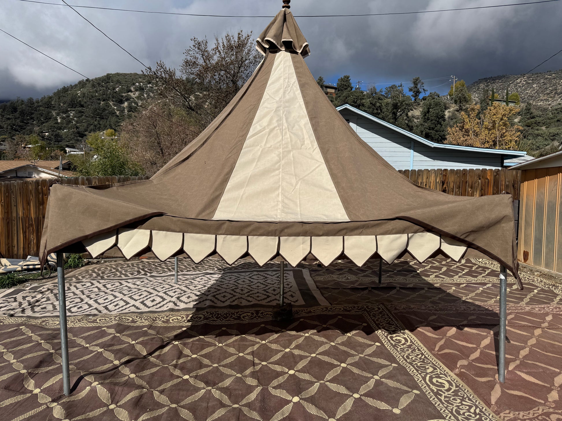 Complete tent system includes: Sunbrella roof top with fire marshal cert sewn in (good for 15-year life of the roof), pole covers, walls; all the custom welded steel parts, top finial, set of ropes, and set of heavy duty J-stakes.